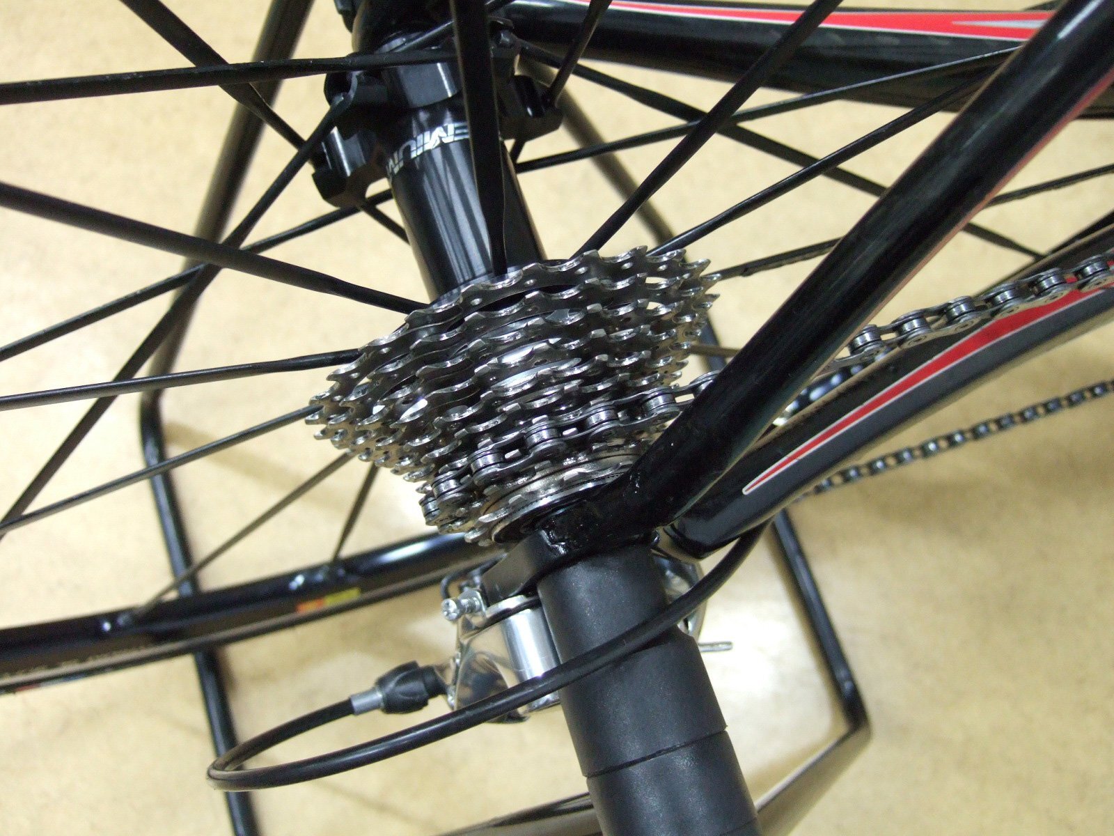 キズが多くあり使用感のあるバイクですが、ホイールはマヴィックの軽量ホイール「キシリウム SL」を搭載してかなり軽いバイクです。当初STIレバーはDURA-ACEのST-7801が装着されていましたがブラケットカバーが未装着だったため、カバーだけを用意することはできないことから、STIレバーは似たような形状のTiagraに交換しています。