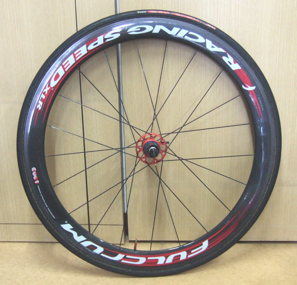 50mmハイトのカーボンチューブラーホイール「フルクラム レーシング スピード XLR 50」となります。年式は不明ですが全体的にきれいなホイールです。パネルの白っぽく映っている箇所は撮影時の光線によるものです。